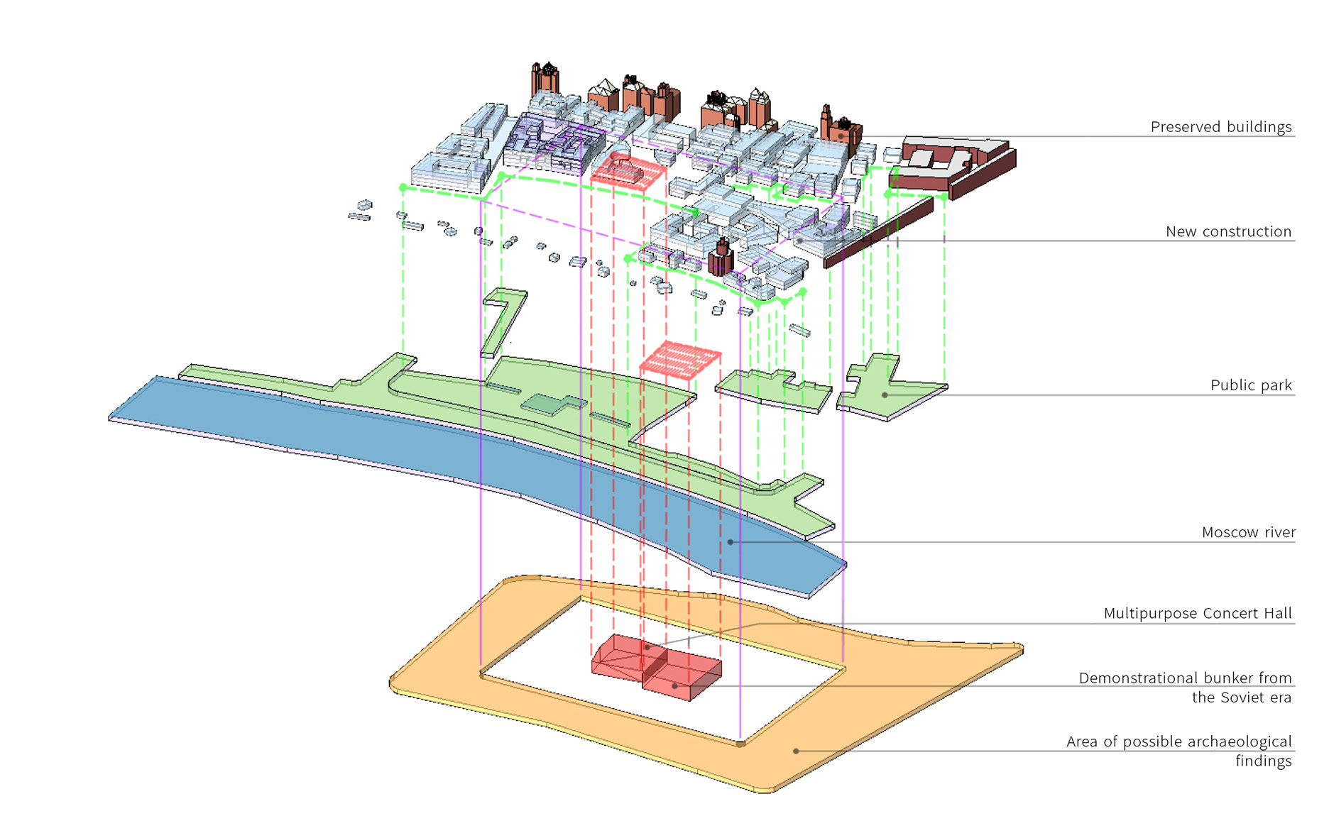 For these reasons main goal of a new concept was to reactivate the project’s area as a public-oriented environment. Caught between two important public spaces (Slavyanskaya and Red squares) Zaryadye, for the moment of project’s creation, was absolutely cut off from the city life. Thus, in the above-mentioned areas with large numbers of people, we could see the lack of recreational areas. Looking for ways to resolve issues mentioned above, the concept of interlacing was born. An urban structure, which scale came from the Middle Ages intersects with the new green urban fabric.